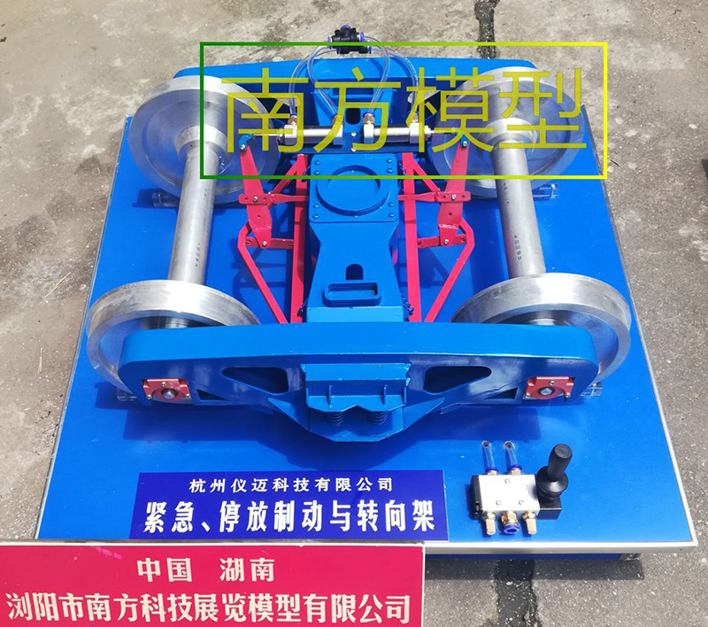 (5) 轉(zhuǎn)向架模型實(shí)訓(xùn)裝置噴涂為實(shí)物顏色 (6) 設(shè)備配路基底盤(pán)和鋼軌,并用止輪器固定 |