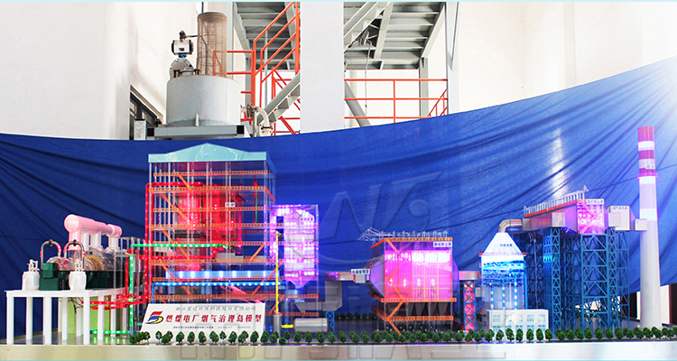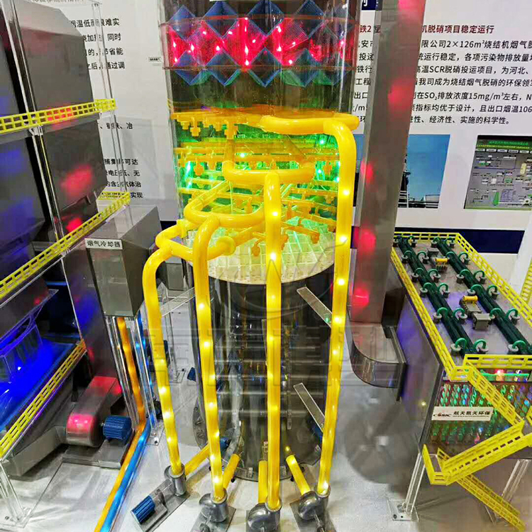 火力發(fā)電廠鍋爐模型 二、鍋爐尾部煙氣凈化處理系統(tǒng) 鍋爐尾部煙氣凈化處理系統(tǒng)包括:煙氣管道、脫硝系統(tǒng)(SCR)、高壓靜電除塵器、脫硫系統(tǒng)(FGD)、引風(fēng)機(jī)、煙囪。 1、脫硝系統(tǒng)模型:(SCR)(比例約為1∶30) (1)脫硝系統(tǒng)采用“選擇性催化還原法” 除去煙氣中的氮氧化合物(NOx)。工作過程:在鍋爐省煤器出口,含有NOx的煙氣,與氨氣均勻混合,經(jīng)反應(yīng)塔(每臺(tái)鍋爐左右兩個(gè))內(nèi)的催化劑后,NOx轉(zhuǎn)化為氮?dú)夂退魵狻?/p> 主要內(nèi)容包括:反應(yīng)塔(2)座及其噴氨設(shè)備、催化劑(3)層。光電設(shè)計(jì)噴氨時(shí)燈光顯示,流進(jìn)反應(yīng)塔的煙氣顏色與流出反應(yīng)塔的煙氣顏色發(fā)生變化,通過燈光顏色的改變來直觀模擬煙氣脫硝的過程。
