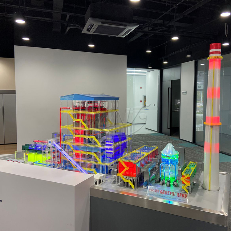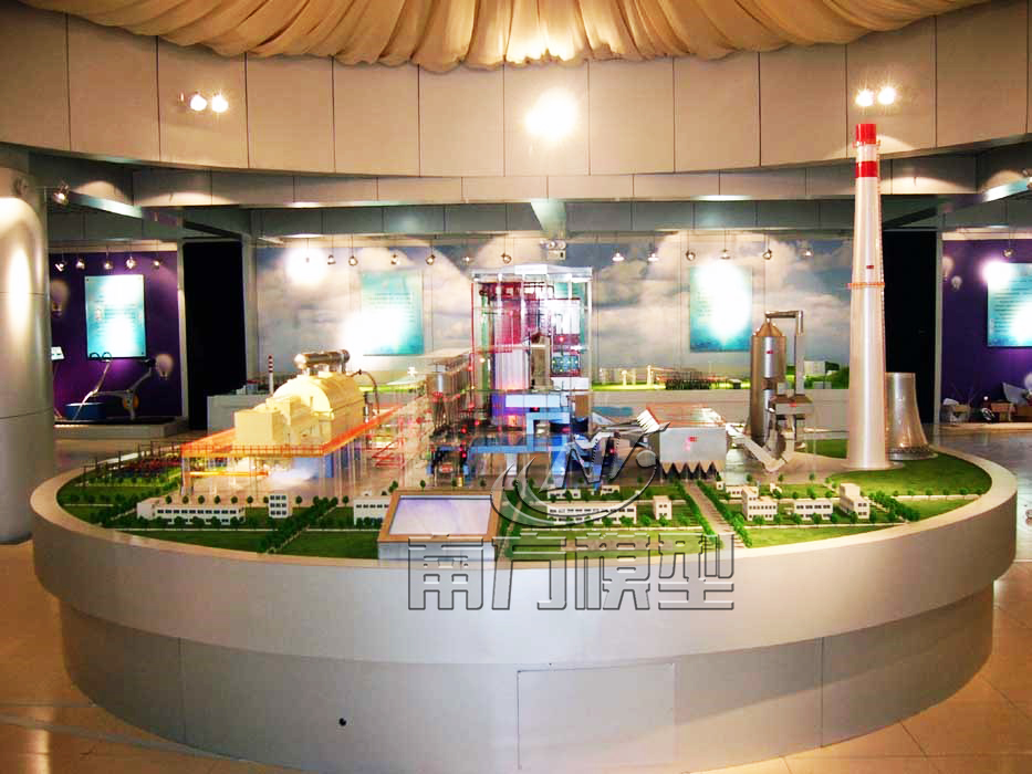 300MW火力發(fā)電廠模型主要系統(tǒng)設(shè)備由燃煤運(yùn)輸系統(tǒng)、鍋爐系統(tǒng)、煙氣處理系統(tǒng)、汽輪機(jī)系統(tǒng)、發(fā)電機(jī)系統(tǒng)與電氣系統(tǒng)等組成,按300MW熱電廠運(yùn)行的300MW火力發(fā)電機(jī)組圖紙縮比制作,300MW燃煤電廠模型包括:鍋爐、汽機(jī)、制粉、除塵、脫硫、脫銷、煙囪、升壓站等幾大部分。將電廠的汽、水、風(fēng)、粉、電幾大系統(tǒng)的設(shè)備,管道以及設(shè)施等按照實(shí)際場景寫實(shí)制作。各系統(tǒng)不同的設(shè)備、管道等分別用實(shí)物配色展示,主要設(shè)備間用燈光顯示,工質(zhì)流動(dòng)方向用箭頭指示。各系統(tǒng)的管道用不同顏色的PMMA材質(zhì)制作,原理準(zhǔn)確,結(jié)構(gòu)清晰。汽機(jī)機(jī)廠房透明或過半剖視,詳細(xì)展示系統(tǒng)運(yùn)行狀態(tài)與模擬汽機(jī)運(yùn)行。輸煤系統(tǒng)部分由輸煤火車、斗輪機(jī)、翻車機(jī)從煤倉斜向上皮帶運(yùn)輸機(jī)將翻車機(jī)、 斗輪機(jī)的煤運(yùn)送到下一工段,輸煤皮帶將煤運(yùn)送到各個(gè)煤粉倉后進(jìn)入磨煤機(jī)。